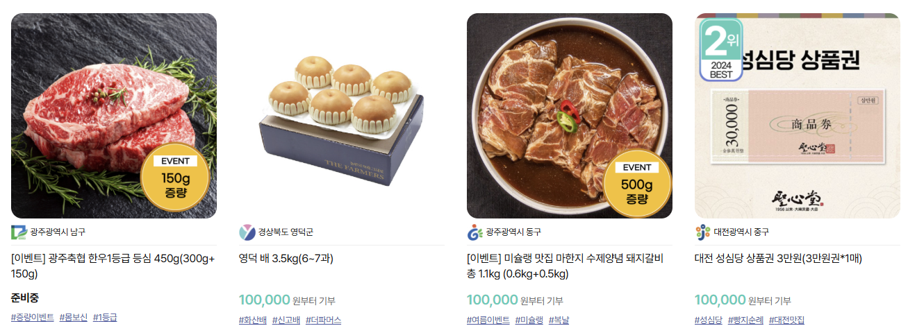실제로 10만 원을 기부하면 10만 원 전액을 연말정산으로 돌려받고, 여기에 기부금의 **30%에 해당하는 답례품(최대 3만 원 상당)**까지 받을 수 있다는 사실에 바로 실행에 옮기기로 결심했습니다.